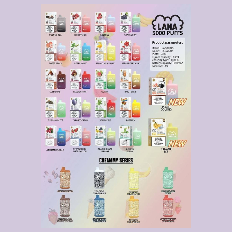 | Favour | Ananas Comosus, Banana Ice, Banana Milkshake, Blueberry Ice Cream, Cappucino, Chocolate Mint, Chocolate Strawberry, Cold Coke, Cranberry, Evian Mineral, Frozen Bubblegum, Frozen Green Grape, Green Tea Ice, Guava, Gummy Bear, Himalaya Tea Guan Yin, Iced Lychee, Iced Taro, Jasmine Fruit Super Mint, Juicy Grape, Lush Ice, Lychee Longan Ice, Mabro Ice Blast, Mango Ice Cream, Mango Milkshake, Menthol Extra, Nutrition Oat Milk, Oolong Tea, Passion Fruit, Peach Grape Banana, Peach Oolong Tea, Peppermint, Pu'Er Tea, Rootbeer, Skittles, Solero Lime, Sour Apple, Sour Bubblegum, Strawberry Ice Cream, Strawberry Kiwi, Strawberry Milk, Strawberry Watermelon, Super Mint, Surfing Lemon, Sweet Peach, Sweet Peach Tea, Tea King, Tie Guan Yin, Vanilla Ice Cream |