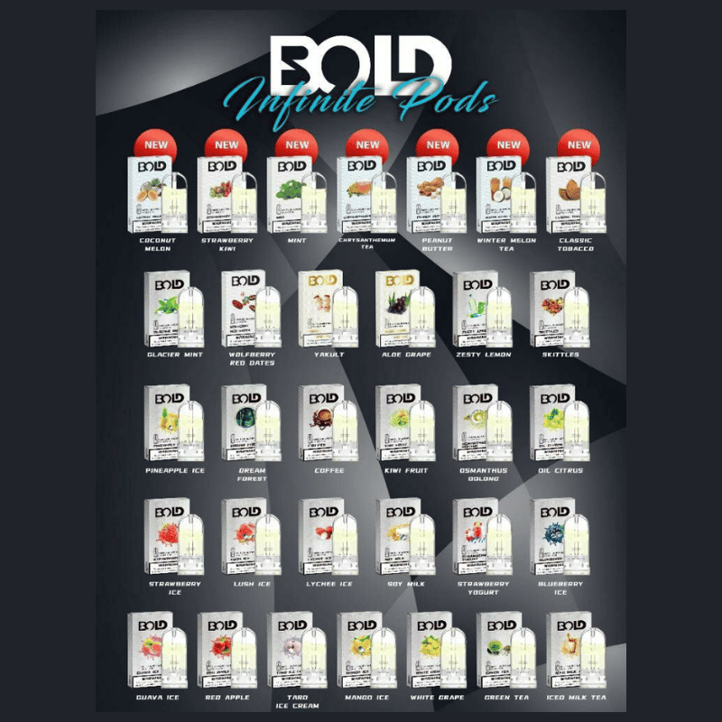 | Favour | Aloe Grape, Apple Sucre, Banana Coconut, Blackberry Surge, Cherry Lime, Fresh Mint, Lychee Orange, Mango Melon Aloe, Mango Orange, Pinenana Melon, Strawberry Grape, Watermelon Chill |
